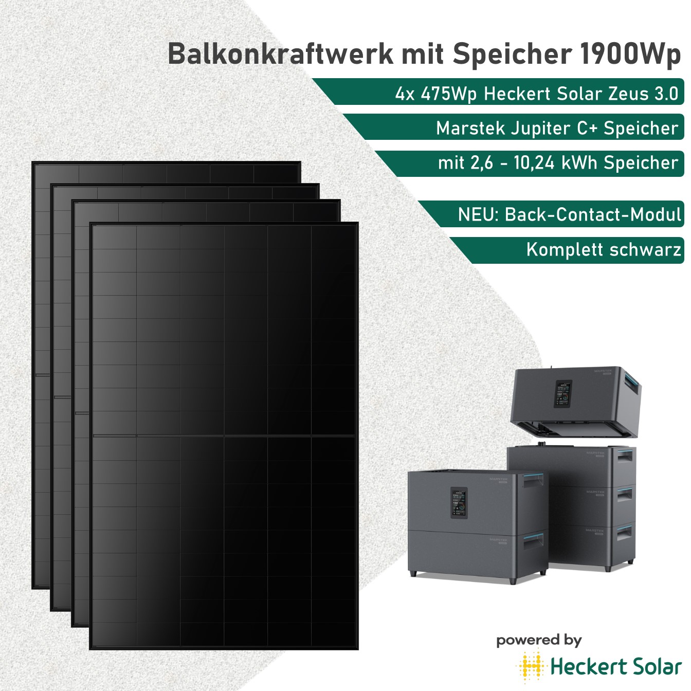 Heckert Solar Balkonkraftwerk mit Speicher Marstek Jupiter C+ und 1900Wp Back-Contact ZEUS 3.0