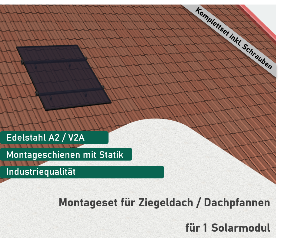 Mit diesem Montagepaket in Industriequalität können Sie 1 Solarmodul sicher auf einem Ziegeldach montieren. Alle Komponenten sind aus korrosionsbeständigen Materialien (Aluminium und hochwertigem Edelstahl 1.4301 A2) gefertigt.